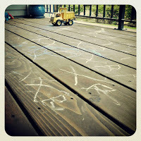 my son's writing on the back deck. aw...Then, a few weeks ago while I was taking my son on a tour of the little Preschool he will be attending this Fall (Ah! School!), a little boy saw me with my simple phone. He asked if I had any games. When I told him: "No, this phone is just for calling and texting," he scrunched up his little face in pure confusion and asked: "Why?"I went on the defensive. Right then and there I decided I was going to get a cool phone and show that scrunchie face a thing or two. I told the boy I was getting a new phone. Soon. So there!