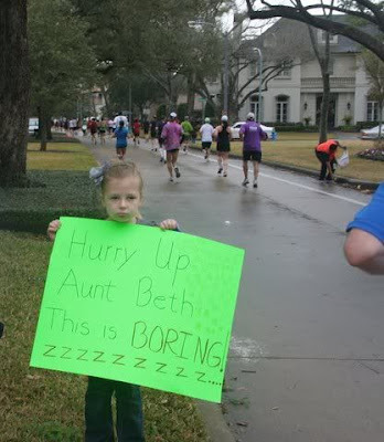 8. Being specific or unique is much appreciated. In the Free Press marathon, where first time marathoners had green colored bibs to reveal their virgin status, spectators give special love and support, with comments like “Way to go greenie!!” Loved this.