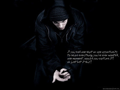 --Most inspirational song:“Lose Yourself” Eminem - a statement to the doubters, a song that builds with rage and immediacy like your heartbeat through the run. It doesn't hurt to be running the Detroit marathon, with the smell of Eminem in the air. And isn't a marathon just one shot, one opportunity? because if you blow it and "let it slip" away, chances are it will be many, many months or a year before you are back in the starting line. "So here I go is my shot, feet fail me not, this may be the only opportunity I got..."