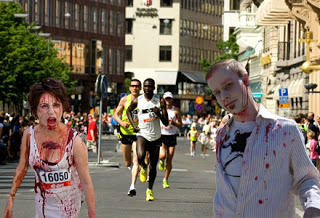 Okay, if you can't outrun a Zombie, you haven't paced correctly.When trying to get a PR, qualify for Boston, or run any certain never before achieved time, it's easy to go crazy with all sorts of mathematical equations in your head, trying to figure out what you need to average for each mile or what to hit with each split, and next thing you know you are caught up in the mythical "put time in the bank" bullsh*t. I have spent many moments back when I was young and foolish (like last week, for instance) writing down all sorts of magical mile combinations of how I could somehow trick the marathon and force a Boston qualifier by running 7 minute miles the first half and then using that 'banked' time to run an easy 8 minute average pace second half. It's a rite of passage the young and dumb need to go through and fall on their face a few times. You don't bank time, you bank energy, and unleash it at the end slowly, putting down the peddle and emptying the tank, squeezing harder and harder like your body's a roll of toothpaste and the trick is to save the very last drop for the last moments, but not too much too soon.