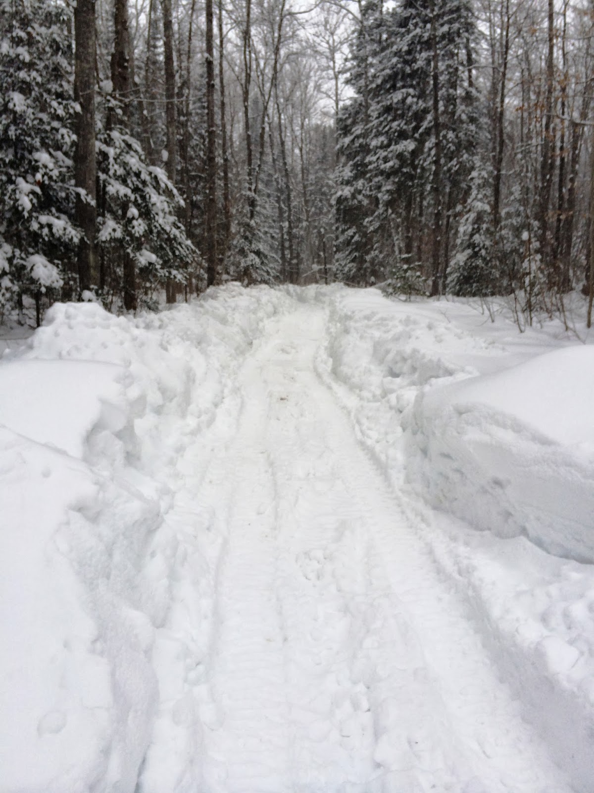 There was some snow on the lot road so I decided to plough in. This little ATV wasn't up to the job, however. So I donned snowshoes and trooped in to the tractor shed to get more horsepower.