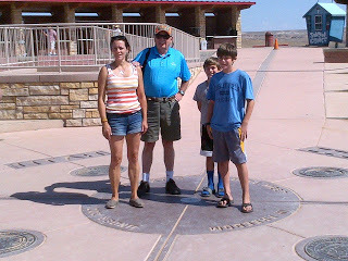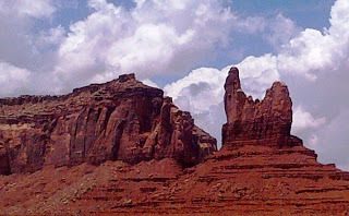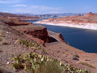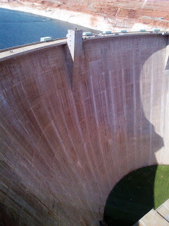 A silly rule blocked the path to getting the photo of the decade today. I couldn't get in to the Four Corners Monument, so missed the chance to stand in four different states at the same time. Four Corners is where the state lines of Colorado, Utah, Arizona and New Mexico intersect. It is the only place in the United States where this happens. The No Dogs Allowed signs were up all over the place, so people with cameras had to settle for snaps of people standing in two states, then bending over to touch the other two with their hands. How contrived! Four paws would have done it nicely, one paw in each state. Even worse, the Navajo Fry Bread stands were inside the No Dog Zone. Navajo Fry Bread is the best treat anywhere in the southwest. The Four corners is Navajo country, seemingly stretching forever across the tops of Arizona and New Mexico and the bottoms of Colorado and Utah. The Navajo are the largest native tribe in the U.S. and have their own government which includes a police force. Despite no fry bread and no paws in four states, it was a wonderful day. The scenery here is spectacular. The canyonlands range in colour from red, to brown, black, white and grey. Throw in some green for the pinon bushes and some blue for the sage. We went through Monument Valley and were awed at the different formations of rock projecting high into the sky above the high desert flatlands. The Glen Canyon Dam creating Lake Powell is a great stop with its modern visitor centre.