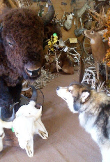 The place is stacked with piles of elk, deer, moose and other animal antlers. Also lots of taxidermy; stuffed deer, wolves, buffalo all with glassy eyes. Very creepy and I began to suspect the folks who run the place had an ulterior motive for inviting me in.