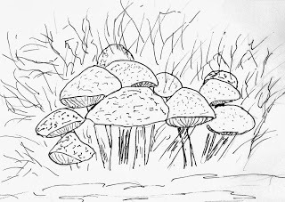 Sketch by Zita Poling Moynan I picked and ate many forest mushrooms years go. That was under the supervision of Emma Tadashore of Sault Ste. Marie, my mother-inlaw, who directed me to pick only the little mushrooms that grew under pine trees. She would examine my harvest, then boil the mushrooms in a pot with a silver coin and a few cloves of garlic. That was back when silver coins still were made of real silver. If the coin and garlic did not turn green, the mushrooms were good to eat. Some people now believe that is just an old wives’ tale. So now I don’t pick any wild mushrooms, especially after reading a New York Times article in which a medical doctor described how he poisoned himself despite following a respected field guide to wild mushrooms. Apparently some of the differences between poisonous and edible mushrooms can be subtle. Ask Nicholas Evans, author of The Horse Whisperer, the popular novel that was turned into a movie starring Robert Redford and Kristin Scott Thomas. He picked mushrooms in the Scottish Highlands, cooked them in butter and parsley, and served them to his wife, brother-in-law, and his brother-in-law’s wife. His wife and brother-in-law were placed on dialysis and wait-listed for kidney transplants. Evans received a new kidney from his adult daughter. This reminds me that despite the considerable time I spend at Shaman’s Rock I know too little about nature. I wish I had spent less time with my nose in computer manuals and more learning about the plant life around me, or the stars in the sky. I was forced to study computer programs to keep current for work. Now I wish I had spent more time studying botany, zoology, and the night skies. These subjects lead right into the reasons for, and purposes of life.