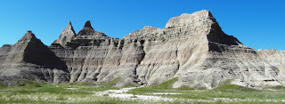 We made some progress yesterday on the ‘Ozzie on Mount Rushmore!’ campaign. Not as much as I would have liked because of those silly dog restrictions in U.S. National Parks. I was allowed up only to the lowest Mount Rushmore viewing level for a photo op. They wouldn’t let me onto the long mall right below the mountain on which the faces of Washington, Jefferson, Roosevelt and Lincoln are carved into the rock. That mall is packed with hundreds of people, most of whom, after giving me a glance, would have supported my campaign. Really what is the government worried about with these restrictions? Do they think I would scramble up the mountain and pee on Washington’s chin? Geez. No educated and sophisticated dog would ever do that. I mean I’ve got American Kennel Club papers, eh. At any rate I’m looking for more support. If you think you’d like to see my chiselled great looks carved into Rushmore, just make a comment on this blog. As mentioned the other day, it seems unfair to have four presidents and no dogs carved into the mountain. I mean look at our contributions to society. And, most people agree I have the most adorable face they’ve ever seen. I should mention that Rushmore is in South Dakota’s Black Hills, a name which leaves a wrong impression. These mountains were named Black Hills because they are heavily forested with dark, green pines and from a distance appear black. They are rugged and very beautiful. We wanted to stay longer but had to make up some time so headed out for the real barren part of South Dakota – the Badlands. We have a good routine going; Marcus is chief engineer looking after electrical/sewer hookups etc. while John is the chief of campfires. Mom does the planning and driving and cooking. The Old Guy just sort of hangs out looking confused and telling stories. We camped in the Badlands. Beautiful white/grey jagged land forms that look like small unvegetated mountains.