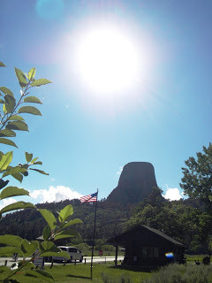 Later we detoured to Devil's Tower National Monument. That's the towering chunk of rock you saw in the movie Close Encounters of a Third Kind. The sky closed in with dark clouds and I heard eerie sounds, the kind that only dogs hear. I figured they were coming to take the Old Guy because some of the things he says make me believe that he communicates with space people.