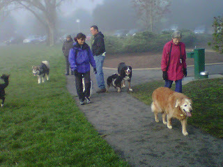 There's no coffee and cookies when I arrive at Rancho Laguna Park outside San Franscisco. I guess that's because none of the dogs gathered is celebrating a birthday. And, numbers are reduced today because it's cold (35F) and the early morning sun is losing the battle to break through the fog.