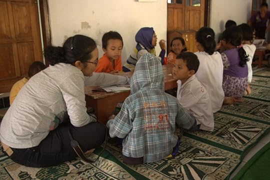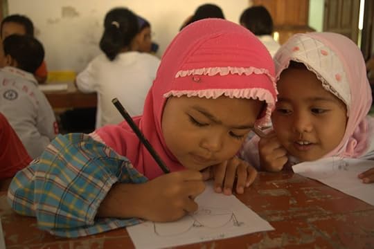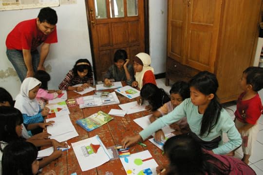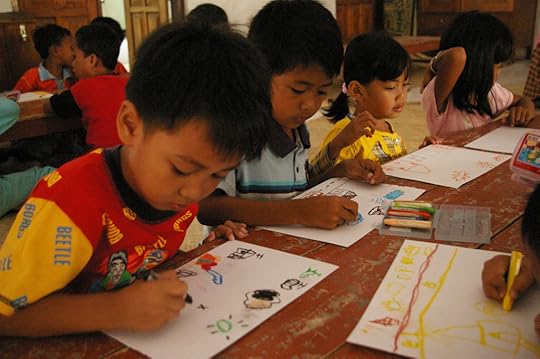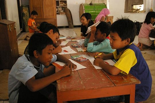 Saat kami mengeluarkan peralatan gambar, adik-adik tadi langsung berebut. Uci sampai kewalahan berteriak menyuruh mereka mengantri. Hebatnya, kali ini gambar mereka sangat beragam. Bukan cuma gambar dua buah gunung dengan matahari terbit di tengah-tengah seperti biasanya. Ada yang menggambar pesawat, kapal, ikan, pelangi, bunga, pokoknya macem-macem deh.