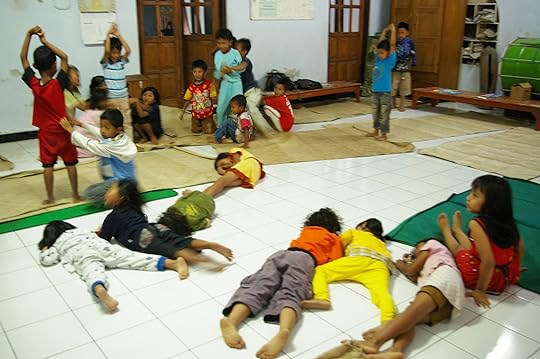 Permainan kedua dimulai dengan penggantian beruang. Beruang kali ini sepertinya sangat menikmati perannya. Dia semangat sekali waktu merangkak-rangkak sambil menggeram-geram. Yang jadi penduduk desanya sebagian langsung pura-pura mati. Anehnya, sebagian anak tiba-tiba pada lari ke pojokan dan mengangkat tangan tinggi-tinggi. Heh? Kami tertawa karena di aturan permainan kan nggak ada pernyataan klo penduduk desa bisa berubah jadi pohon?