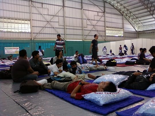 Waktu sampai di penginapan, saya langsung bengong. Kami harus nginep rame-rame Gedung Olahraga! Saya benar-benar kaget karena asumsi saya, kami akan menginap di hotel. Saya cuma bisa terharu aja waktu lihat ratusan lampit warna-warni berjajar rapi di seluruh bagian. Ini mah kamp pengungsian. Tapi penginapan seperti ini ada keuntungannya juga. Tiap peserta bisa lebih mudah berinteraksi dengan peserta lain karena nggak ada sekat kamar. Kami jadi lebih cepat akrab dan gampang membaur dengan teman baru dari lokasi lain.