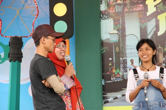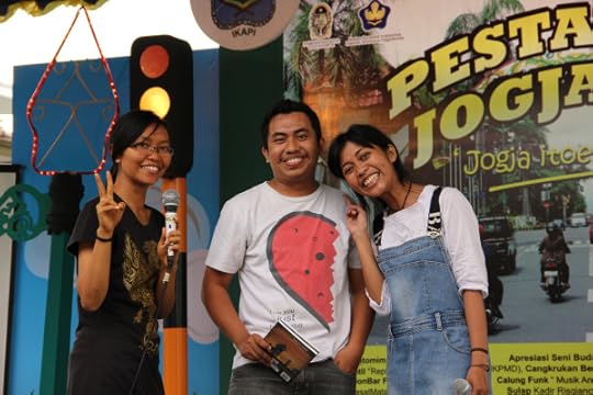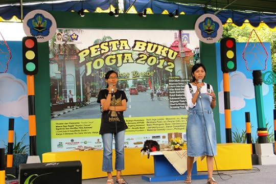 Awalnya sih kami sempat bingung juga, sebelum acara kan saya cuma menawarkan diri jadi MC. Niken Anggrek apalagi, dia kan datang untuk jadi penggembira, tahu-tahu disuruh maju. Berhubung rada banci tampil, ya udah kami sok cuek. Jadi, kami mulai dari bagi-bagi buku dari panitia. Yang pertama buku tebel tentang Rahwana. Nah, pengunjung yang mau dapat buku ini harus maju sambil cerita tentang buku favorit yang mengubah hidupnya. Ada mbak-mbak berkerudung maju, lupa namanya karena ada banyak nama baru