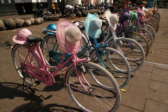 Saya lebih tertarik untuk memoto sepeda-sepeda yang disewakan. Warnanya lucu-lucu, ada pink, hijau, biru, putih, dan ungu. Uniknya lagi, tiap sepeda dilengkapi dengan dua buah topi dengan warna sama seperti sepedanya. Biasanya, satu topi perempuan dengan hiasan pita atau bunga, dan satu topi untuk laki-laki. Sepertinya para pemilik sepeda tahu kalau orang Indonesia nggak suka panas-panas karena takut hitam.