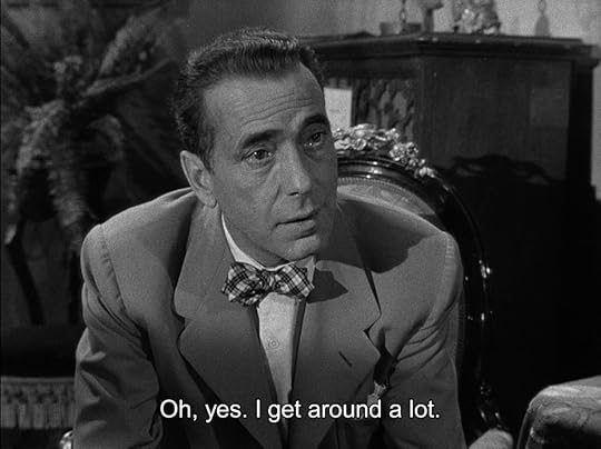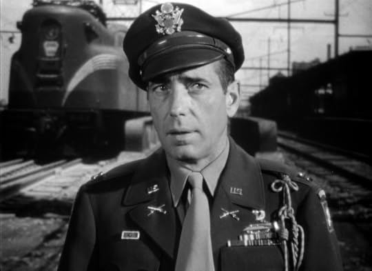 Rip makes a transition in character that isn’t totally believable. We buy it because it’s Bogart, and we’re used to seeing Bogart perform in a certain way: confident, savvy, independent, a man with smarts and tough talk, knowing how to handle the ladies, calling all the shots. But we see little of this at the beginning of the film. Rip is just a typical soldier, maybe a bit atypical because he and Johnny are about to be decorated, but it’s clear that Johnny is the one who’s more worthy of being honored. Rip seems like a regular G.I. who’s used to following orders and was just doing his duty. But once he hits Gulf City, Rip becomes Sam Spade, complete with hardboiled banter and mannerisms that seem as if he borrowed them from The Maltese Falcon clearinghouse. When Rip discovers a dead body in his room, he’s got the smarts and resourcefulness of a Sam Spade, knowing exactly what to do without a second thought.