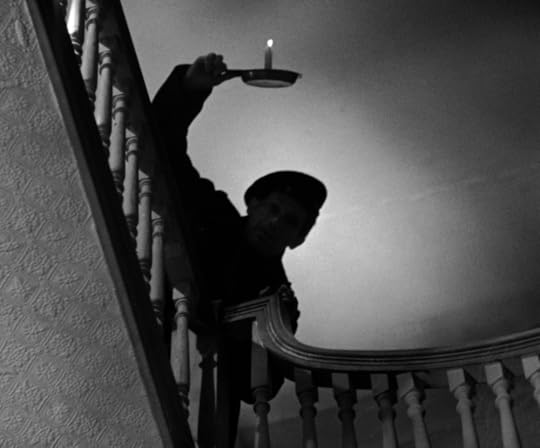 Number Seventeen opens with a tracking shot presenting strong gusts of wind not only scattering leaves along a nighttime London street, but also blowing a man’s hat onto the doorstep of a darkened house. The man (John Stuart) follows his hat to the mysterious dwelling marked “For Sale or Let,” a structure also designated with the number 17 in an upper window.