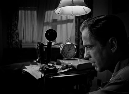 I love this shot. I could easily spend an hour examining each part of the image, the clock atop the book (the title of which I cannot read; maybe you can), the fact that both the face of the clock and the telephone earpiece seem to be staring at Sam Spade, the arrangement of papers under the phone, but mostly what fascinates me is speculation on what's going through Spade's mind.