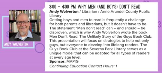 And on May 11 I'll be speaking at the Maryland Library Association's annual conference on the topic "Why Men (and Boys) Don't Read."