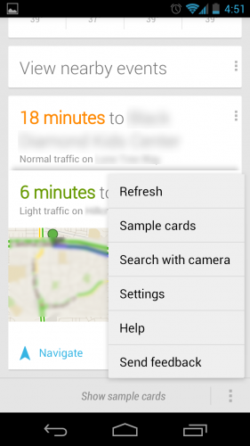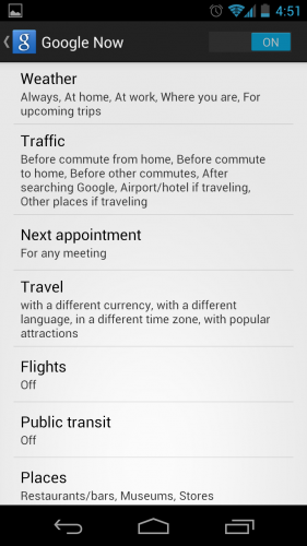 From here, you can access all the Google Now settings. Currently there are over 25 cards to choose from, including Weather, Traffic, Flights, Places and more. Touch each option as needed to modify the settings as desired.