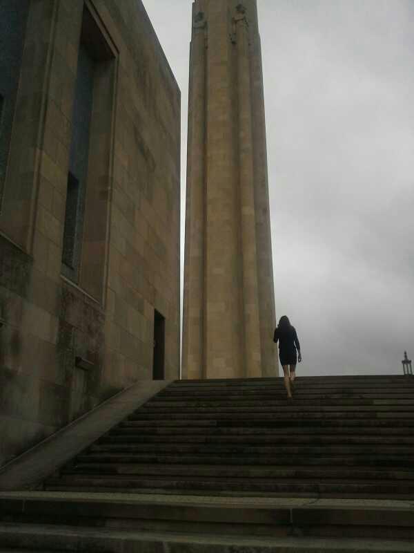 Climbing the stairs at the Liberty Memorial WWI Museum. There's a fantastic view of the city at the top!