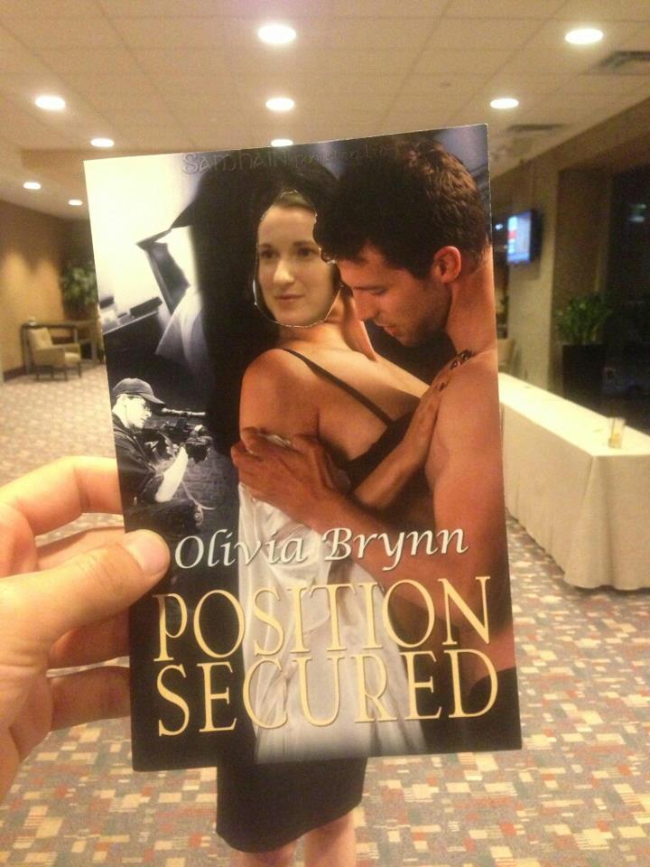 It wouldn't be RT if I didn't make time to goof off. When Alanna Coca & I discovered some (non-RT) guys who'd been wandering down promo lane & picking up cover flats so they could put their heads on cover models' bodies, we knew we had to try it too. Here, Alanna skillfully cut out the female model's face so mine could go there. Check out my book boyfriend! LOL