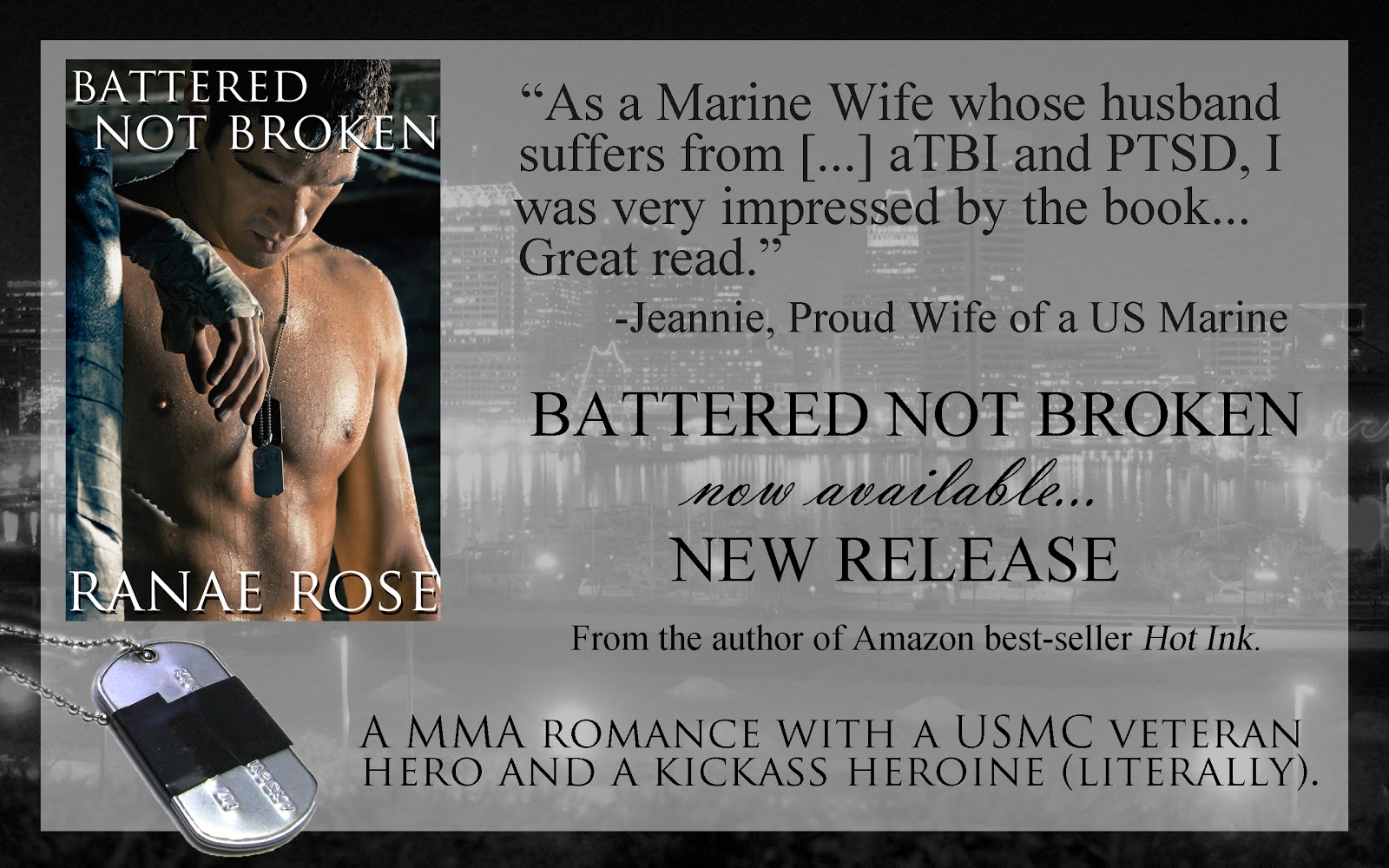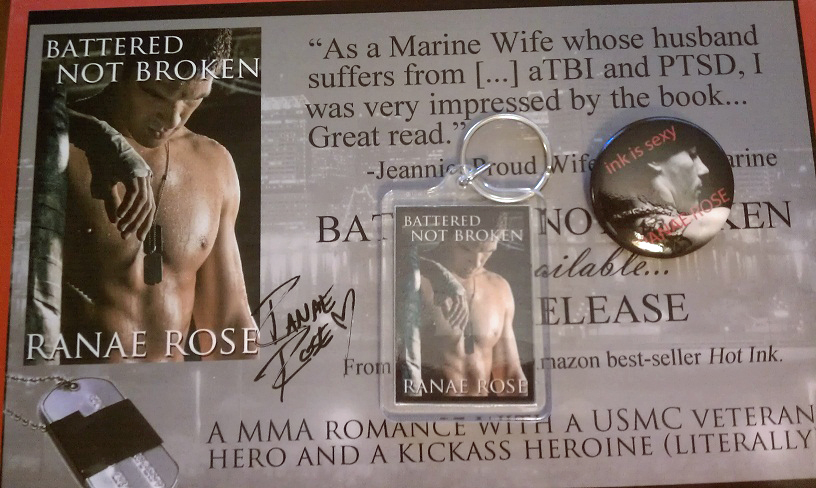 Plus, I got to cross two things off my writing 'bucket list'. I have a mental list of themes I really want to write at least once someday. MMA (mixed martial arts) romance and a US Marine hero have been on that list for a long time, and I wrote both of those in Battered Not Broken. :)