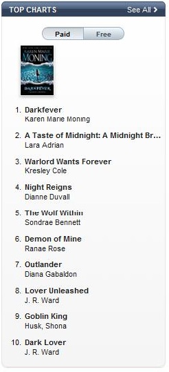 The point = I was dorky enough to take this screen shot, forever immortalizing the moment of my novel rubbing elbows, er, pages with my beloved favorite Outlander on the category top 10 chart.