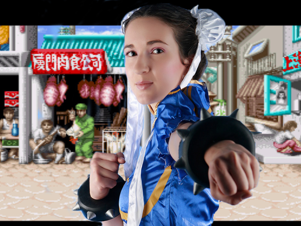 I had this photo done last year, and as you can see, I photoshopped myself into a screen shot from the Street Fighters Turbo game of my childhood so that I could kick pixelated man-butt just like my heroine.