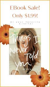 JUST A QUICK FYI: Things I Never Told You, book 1 in my Thatcher Sisters Series, is on sale for only $1.99 — the e-version. The Best We’ve Been, the final book in series, releases this May, so this is a great time to start the series or re-read book 1. Just click here or on the image below to take advantage of the sale.