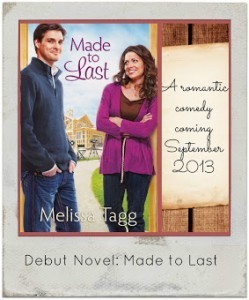 Melissa Tagg is a former reporter turned author who loves all things funny and romancey. Her debut novel, Made to Last, releases from Bethany House in September 2013. In addition to her nonprofit day job, she’s also the marketing/events coordinator for My Book Therapy. Connect with Melissa at www.melissatagg.com and on Facebook and Twitter(@Melissa_Tagg).