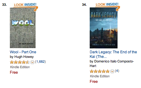 It was quite an exciting experience watching Dark Legacy: The End of the Kai rise to the #2 position within the Fantasy genre and #24 in the Science Fiction genre. I was especially pleased to see the ebook ranked at one point alongside Wool - Part One by Hugh Howey, which can be seen in the photo below.