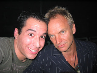 It was then that we all saw Sting and his entourage enter the backstage (his musical entourage included Moroccan percussionist Rhani Krija). Ian and I were totally starstruck to see a musical legend right there before us. Our agent encouraged us to get back to the dressing room and to not speak to Sting. I told him that there was no way I was going back to the dressing room and that I was going to stay and watch Sting perform from backstage. He asked us again to go, but we collectively said no. It was then that I decided to approach Sting to ask him for a job. I have nothing to lose, I thought. Why not? So with my digital camera in hand to take a photo with him after I asked my question I approached Sting who was fiddling with his acoustic guitar and asked him if he needed a drummer. He responded by saying that he had enough problems with the drummer he currently had (he was referring to Keith Carlock). I then asked the "King of Pain" for a photo and he graciously complied, which absolutely made my day.