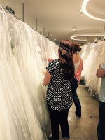 My sister was celebrating her 50th birthday in NYC with her daughters and I luckily got to be a part of the trip. One of my nieces recently became engaged and has started down that long road that many women dream of; planning a wedding. She has been to several bridal appointments around her home town in Texas and while in New York City, had a scheduled appointment at a well-known NY bridal place made very famous by a reality show. (I'm sure many readers know right away what spot that is.) They had an amazing afternoon, but never had that moment of saying yes to the dress. Sitting around a hotel and hearing the story of the afternoon, my sister thought it would be fun for us to go to another place so I could see her baby girl trying on dresses. There happened to be one right on the street as their hotel. Even though it said online it closed at 7 pm, we showed up around 5:50 and was told by a very nice woman that we could look through the aisles and take note of the dresses she liked. However she wouldn't be able to have a consultant helping her as all were busy so she would have to return the next morning and wait in line to be seen.