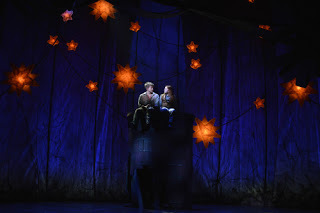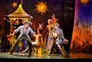 The musical has a beautiful look thanks to Walt Spangler, costumes by Gregg Barnes, lighting design by Kenneth Posner, and sound design by Brian Ronan. Yes, I'm discussing those elements first because for this audience member, they were the most exciting things on that stage.Director/Choreographer Casey Nicholaw (who I love his Something Rotten) has taken what should be an intimate story and turned it into an overblown musical. I think what many critics complained about Big Fish when it ran on Broadway will happen with critics of this show. The producers picked the right theater with the Broadhurst (which usually houses plays) to tell the intimate story. The set designer has pulled everything in to add to that feeling of a smaller show (which would be greatly told in the round even). However, the decision to add a large ensemble instantly removes us from the story at hand due to the way they are used. Dancers appear all throughout the show for no reason whatsoever. Are they townspeople? Are they woodland fairies? We don't know. They are just there to distract from what the leads are singing about.