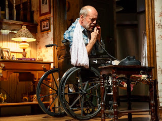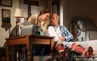 If you read the Stephen King novel, you would know that Paul Sheldon is a novelist who after being in a car wreck finds himself being cared for by his number one fan. Rob Reiner directed the film version which starred Ms. Bates with James Caan and was full of thrills and yet still some humor mixed in. The screenplay and the stage adaptation were both penned by William Goldman, but stage director Will Frears has a tougher time conveying things that a film could do with a simple close-up. So instead of thrills and chills, this version is big on laughs. And the audience laughs...a lot. Even at times when one can't understand WHY they are laughing.