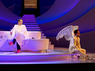 Much of what is happening on stage had me laughing out loud while other points may be a little cringe-worthy to some. The joy of this evening is the fact that God has inhabited Jim Parsons' body and what we get is Jim being Jim. It's fun, it's irreverent, and it's a great way to spend 90 minutes of your time. I'm not sure that Christopher Fitzgerald and Tim Kazurinsky are truly needed as angels, but they do add for some fun sight gags, a little audience participation, and both are very talented men. But it is Parsons many are here to see and he delivers. How one can memorize an entire show such as this is an amazing feat. Half talk-show (he is sitting there on a sofa for much of the show) and half stand-up, his God is a funny deity that has much to say for how things have gone down since the Commandments were first written.