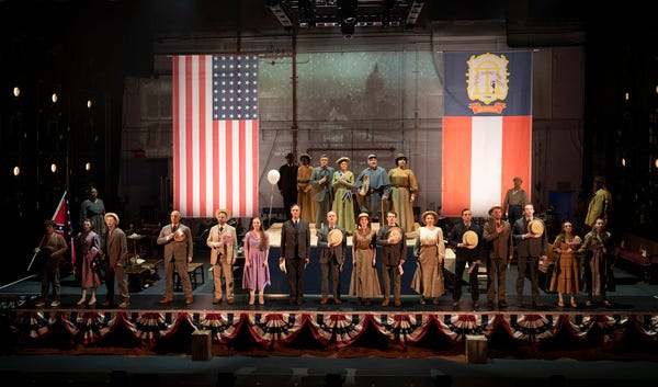 Parade is based on the true story of Leo Frank. A NY Jewish man who moved to Georgia to be with his wife, put on trial for the death of a young girl and convicted in 1913..and lynched by a mob in 1915. So much of this hit me harder 24 years after it initially ran on Broadway. Not simply because there is so much anti-Semitism happening in America now, but because America is so divided. The show starts with the beautiful anthem “The Old Red Hills of Home” which encapsulates the souths love for…well…the south. They were/are passionate about their feelings for America and the values they hold. They were/are driven by the Civil War and what they truly believed they were fighting for. The RED HILLS jumped out at me as we are divided between Red & Blue states (as we march towards midterm elections). The mob mentality of what happened to Leo Frank is played out again and again in real time and on social media in 2022. So much of this show feels true to day even though the story took place over 100 years ago. I feel it’s such an important piece of theater that directly relates to what is happening in the world now.