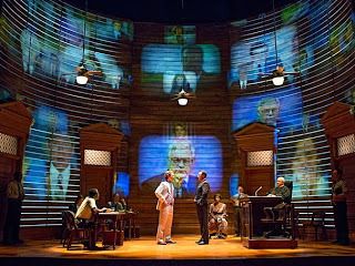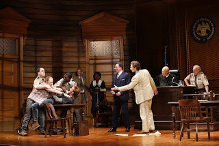 We (the audience) were the jury - and so close to the great performances being displayed by TV favorites such as Tom Skerritt, Fred Dalton Thompson, and Ashley Williams along side some of Broadway's best with Sebastian Arcelus, Patrick Page, John Douglas Thompson, and Tonya Pinkins. All of the performances were wonderful, but it is Patrick Page that stood out mostly for me. Playing the prosecutor, Page creates an evil foe to Arcelus's young DA Jack Brigance without ever going overboard into stereotype. I was completely pulled in by his slimy ways complete with constant lint picking from his suit, fixing his pocket handkerchief and ability to get red-faced in an instant as well as that amazing bass voice. It is hard to condense this huge novel down and still keep characterization intact. When the play is concentrating on the trial, it is at it's best. I applaud director Ethan McSweeny and the creative team for taking a chance on an adaptation that would be so closely compared to the film. And for those that were able to catch the play in its short life on Broadway, we were offered a great night of drama.