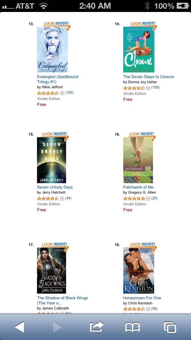 The entire third day afternoon/evening was a complete whirlwind of activity. By midnight (NY time) of that last day of the promotion, I actually climbed even more to #25 Free in Kindle Store. And the rate of downloads per 1/2 hr was out of this world for this indie author. I was completely blown away! (If only Amazon allowed authors to share that info.) Knowing Amazon counts Pacific time, I did wake and grabbed this screen shot at 2:40 am (my time).