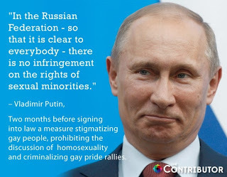 When I visited St. Petersburg, Russia in 2008, luckily my partner and I traveled with a female couple and even then we felt the need to 'pretend' to be heterosexual couples. I now realize I could never safely go back to that country. When you travel abroad, we are always taught we abide by the laws of that country. The same when visitors come to America. And yet I’m reading where the LGBT community is being told to visit Russia next year during the Olympics to make it ‘the gayest Olympics ever’. That doesn't seem wise to me. To blatantly break a law of a country in which you do not reside doesn't seem logical.