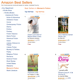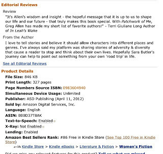 The book had been out for a year and I thought I'd see what all the talk was about running limited free access to a book. Several people will ask why authors do this and I think the answer depends on the person.Still, I thought I'd try it again with my 2nd novel that came out on 4/15/12. But this time, it was 4 & 16 that were important numbers. For another three days, I placed Patchwork of Me as a free download. I called it "Christmas in July" as I was giving away a gift (of a book that actually has Christmas in it), but in the end I was the one to gain a huge gift.To gain new readers. Authors write because they want people to read. The hope is to find those people on kindle looking for free books and get them hooked on your writing style.To gain more sales. I know this may sound strange since it is free, but for authors will multiple books - the hope is a reader will look up their other books and buy another.To climb the Amazon chart and get noticed. There was a time this may have made sense, but it seems the Amazon landscape changes monthly and I'm not certain climbing a free ranking really does anything for an author any more.
