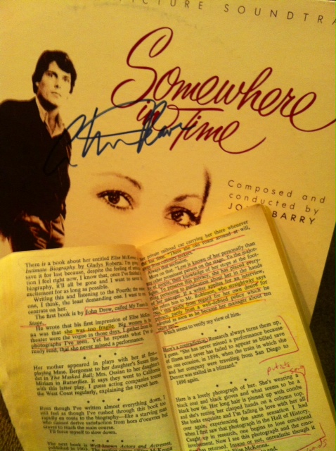 Christopher Reeve autographIs there something you are so obsessed with, but don't want people to know just how much you are obsessed with it? Well - I'm about to share how much of a true freak I am.Back in 1989, after watching the video of one of my favorite films (Somewhere in Time - the romantic time-travel movie), I said to myself "That would make an incredible musical." I stayed up all night writing an outline and then set out to find the book the movie is based on - Bid Time Return by Richard Matheson. I bought a used copy of the book from someone in Arizona and then wanted to find out if Universal owned the rights. (In the photo - you can see how much I marked up the copy of my book writing myself notes for the musical.) All along, I was still writing the musical as my obsession was too great to stop. Adding additional characters to have a secondary storyline for a musical. Writing a counter melody for the protagonist to sing against the music used in the movie (Rhapsody on a Theme of Paganini.) And then discovering that Mr. Matheson retained the rights even after the movie was made in 1980.