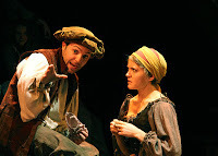 Monte has made wonderful use of this 'prison playground' in the telling of her story along with fight director Rick Sordelet. Her placement choices of scenes such as Aldonza's abduction give wonderful impact without being too jarring in this intimate space. Her art of storytelling is evident in this the first musical the group has produced since 2004 and the way she has chosen to use the entire ensemble. I mentioned Monte's unique production earlier in that she has made different casting choices in some of the roles. One of those is casting Jane Pfitsch as the service woman/prostitute Aldonza. With her cropped, dirty-blonde locks, Pfitsch does not match the stereotypical look of other actresses that have portrayed the role and at first, I'll admit I was thrown. Then I was pulled into this tough, earthy take on the character that looked different from the other women in the ensemble. It caused her to stand out both to the audience and to Quixote. Pfitsch's acting moments are so grounded that I found I was transfixed by her when she would enter. Powerful