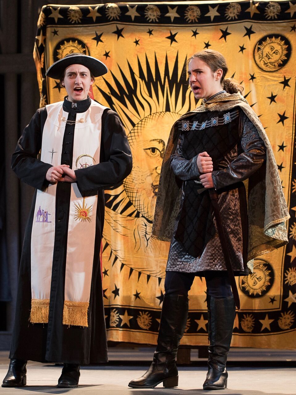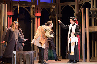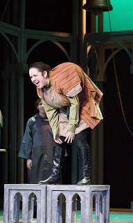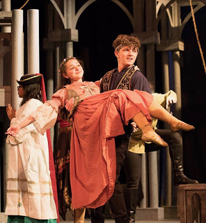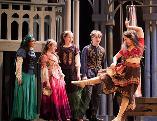 Half of the cast took on the roles normally played by men and didn't miss a beat. Frollo, Quasimodo, Phoebus and a few others characters were very talented teen girls playing the roles. They inhabited the roles by changing posture, voices, and were highly believable while still allowing themselves to shine through. The audience went along on the journey and just bought into it much the way early Shakespeare would have men playing the female roles. The cast can be upwards of twenty with this show, but these 11 changed characters quickly and told the story flawlessly. I was absolutely transported from the sheer joy of watching these teens take on this challenge of such a big show and master it as an ensemble that put the story over anything else. Those 11 voices displayed some of the finest choral sounds I've heard coming from a choir - and this show has a lot of choral type music. (Another nod to Fiona Santos who not only co-directs, but is also the MD.)