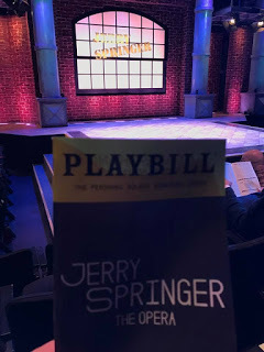 Director John Rando has made great use of the space and completely immersed the audience in the experience. Chris Bailey's choreography is also on point for this show, this space. I love the live band upstairs, the use of video, and the way the cast runs around changing constantly to become different people. My one only complaint would be that the words come fast & furious at times and you really need to pay attention to hear them all. This show is NOT without controversy which is why I wonder if it will ever land on Broadway. (But hey, Book of Morman survived.) This show is full of obscenities. You laugh, you cringe, you assume it's simply holding up a mirror to the actual guests and audiences on the Jerry Springer show under all of those bleeps. It also goes in hard on religion and has been protested and blacklisted along it's journey the past 15 years. I suppose we'll wait to see how New York reacts to the current incarnation of the show. But if