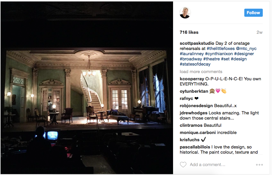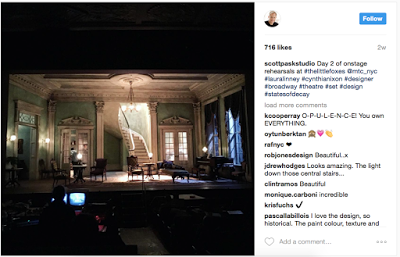Set Designer Scott Pask's instragram photo of the setThe rest of the cast is also so wonderful - including the brothers that you just want to hate. Michael McKean as the older brother Ben Hubbard transforms into a true southerner in the role. Darren Goldstein with an over bloated ego the moment we see him unravels as Oscar. These two have some wonderful moments with sister Regina. We don't see Richard Thomas until act 2 when Regina's sick husband Horace comes home, but what a force he is on the stage. A sick man, still in charge of his destiny, but with a love in his heart - well, at least for his daughter Alexandra. Francesca Carpanini plays that role and along with Michael Benz as Leo represent the younger generation from 1900 (both making their Broadway debuts). One that wants to be like the family and one that doesn't. I love Carolina Stefanie Clay as Addie and Charles Turner as Cal. Every moment they are onstage, they ground the play in a way the family members caught up in deceit simply can't. It was also great to see David Alford on stage as Mr. Marshall as I only know him from his TV show. The play may be an older one, but the family drama could be playing out today. The Hubbard family represents those men that constantly need to climb the financial ladder no matter the cost. And there is Regina...fighting every step of the way to have women viewed on the same playing field as men. The world hasn't changed much in over 100 years.