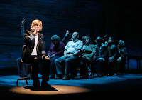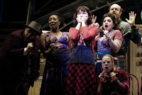 Sankoff and Hein have written a beautiful piece that many people may not know. In the middle of a horrible time in our country's history, these people found community and it's stunning to witness. It's also wonderful to know so many in this show are based on real people, real stories - and you can sense it. It's not maudlin, it's uplifting. It's funny. It's powerful. (There is a moment where many religions converge during The Prayer and it's stunning.) The music is different from what we're used to from Musical Theater (being a former BMI Musical Theater Workshop student - I always notice this), but it fits perfectly with the rhythm of this show. Sometimes it's best to break the rules! Bravo to these two nuanced writers! Beowulf Boritt has designed a simple set on a turntable with mismatched chairs. Howell Binkley provides wonderful lighting and both of these elements let us know where we are every step of the way.