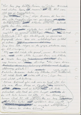 Ammisadu talar sanning; han kommer verkligen från en annan berättelse som jag skrev men aldrig fick förlagd. Romanen hette Bronstjuren och jag stötte på det handskrivna manuskriptet från 1985 när jag grävde i gamla papper inför det förra blogginlägget. Nedan ser ni en sida ur manuset som visar hur jag arbetade innan det fanns persondatorer (jag skrev sedemera rent manus på skrivmaskin).
