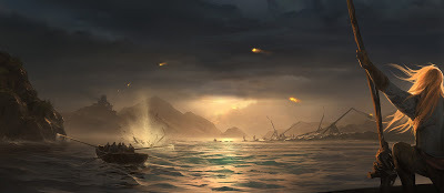 Scenen ovan föreställer de vandöda crurernas försök att ta sig över sundet från Marjura till Clusta Noba – de levande människornas sista fäste i trakten. Crurerna bygger en bro mellan öarna genom att tålmodigt bära sten och släppa i vattnet mitt i bild. Som av en händelse skriver jag just om detta i romanen för tillfället.