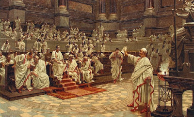 Bilden föreställer Ciceros angrepp på Catalina i romerska senaten, av Hans Schmidt 1913. Jag har faktiskt den här bilden i form av en gammal skolplansch i mitt sovrum. Cicero figurerar för övrigt i romanen liksom många andra romare.