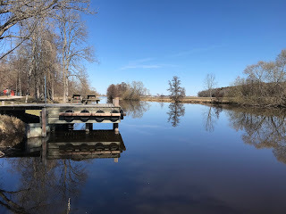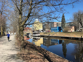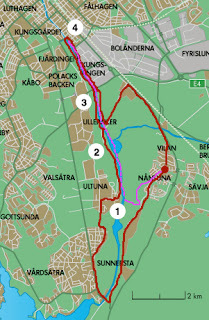 Årets första längre cykeltur gick längs Fyrisån, medurs längs den röda linjen, utgående från pricken i Nåntuna där jag bor. Syftet med resan, förutom att komma ut i solen och få lite motion, var att rekognoscera för romanen. I de första kapitlen rör sig några av huvudpersonerna enligt den violetta linjen in till Uppsala med den romerska ubåten Rhea Svea uppför ån. En av protagonisterna råkar bo helt nära mig, i ett hus han ärvt av sin moster.