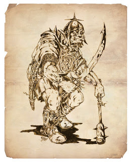 Orch av Nisse GullikssonDet var alltså givet att spelmiljön förutom människor skulle innehålla orcher, alver, dvärgar, levande döda, mytiska bestar etc, men ambitionen var att göra något nytt av dem utan att för den skull gå för långt ifrån det förväntade. Själv tycker jag att det fungerat mycket bra, att hotande spretighet och klichéer istället känns som en fräsch helhet. Exempelvis inspirerades jag av Nisses flinande, kaxiga bild av en rese och gjorde resarna till anarkistiska järnåldershårdrockare med ett säreget ursprung som avslöjas i spelet.